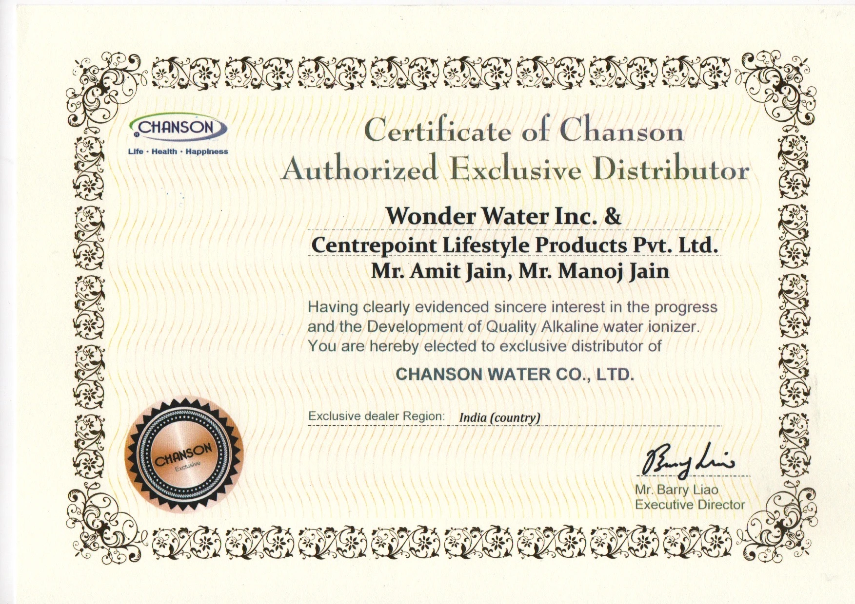 Centerpoint Lifestyle Products Private Limited (India's exclusive distributor of (Chanson Water Company Ltd) for distributing water ionizers is aggressively marching forward to multi fold its growth in India. Few of our esteemed customers like ministries, Govt. offices, celebrities, scientists, doctors, hospitals, schools, universities and industries. We have our presence in Pan India with more than 1351 service centre's. We have certified testimonials of our satisfied esteemed clients for supplying world class water ionizers and after sales support. Changing water, Changes Lives!